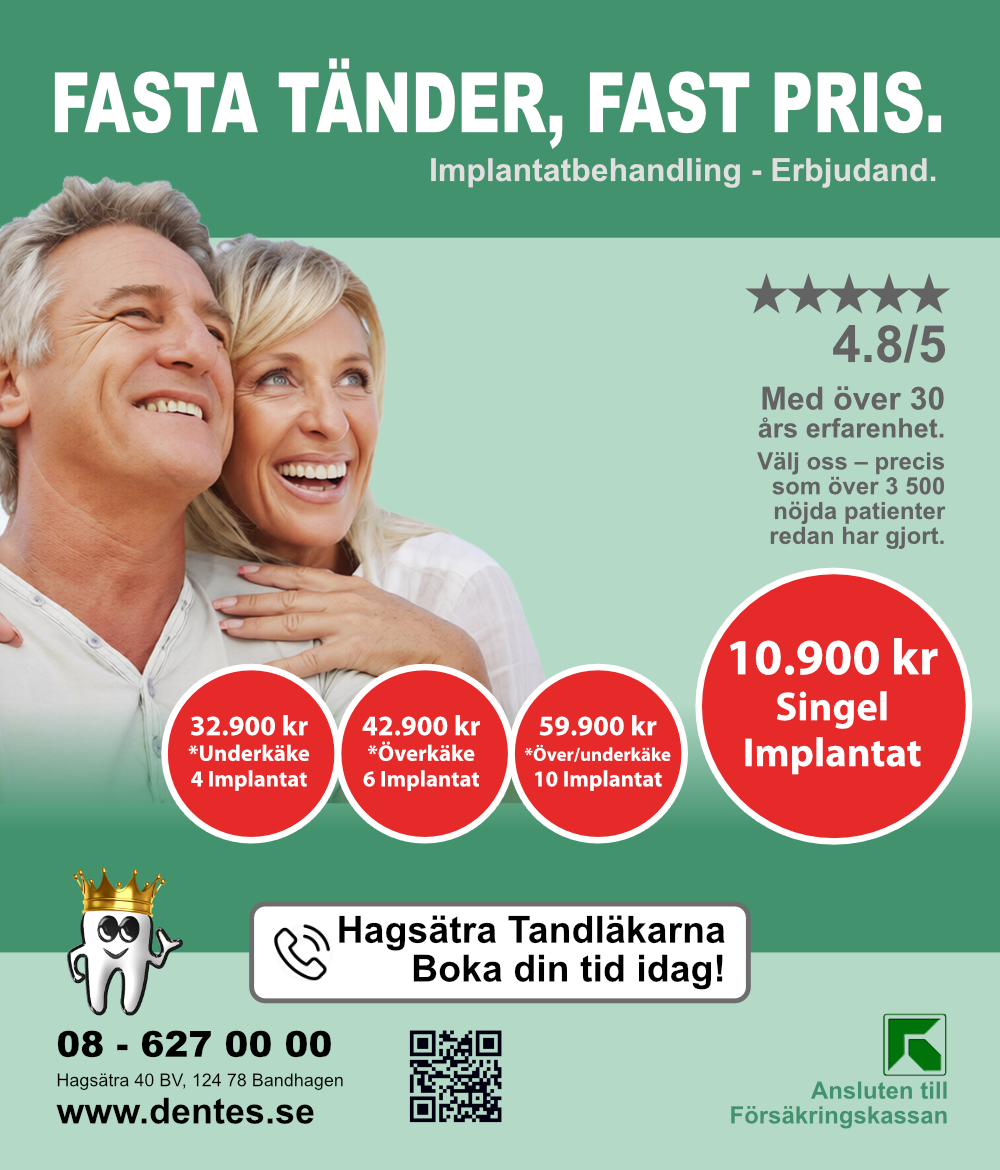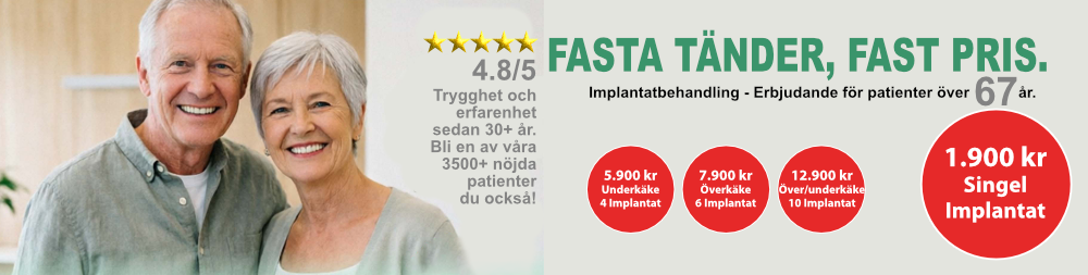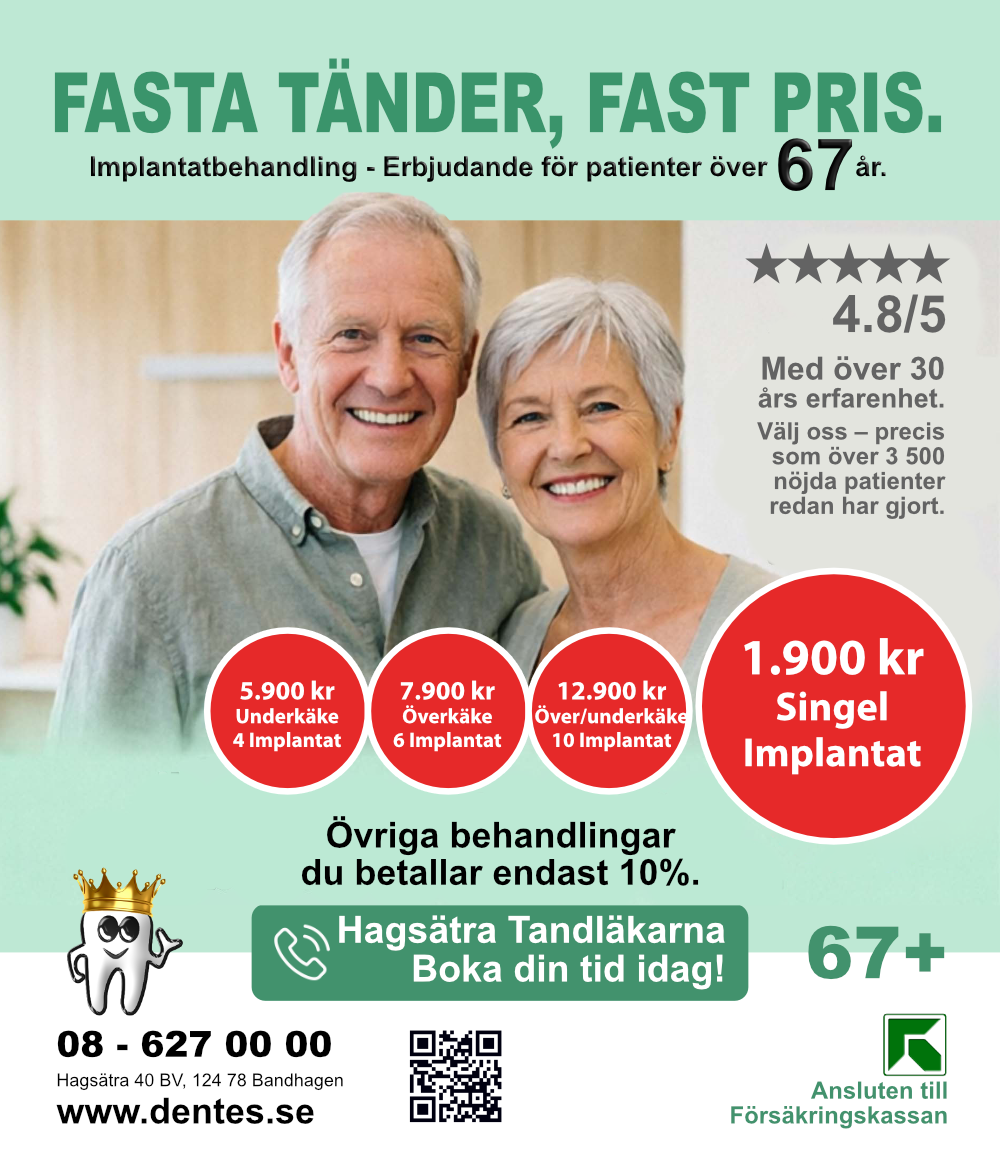 Implantatbehandling – Erbjudande för patienter över 67 år från Hagsätra tandläkarna .